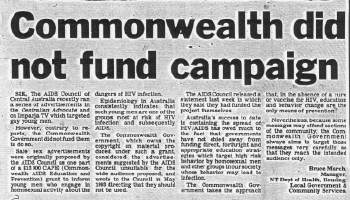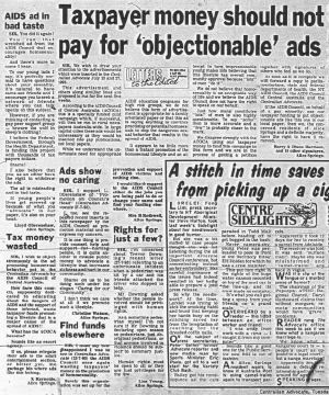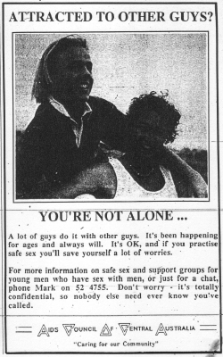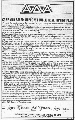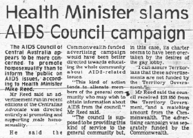 The AIDS Council of Central Australia appears to be more concerned to promote homosexuality than to inform the public on AIDS issues, according to Health Minister Mike Reed. Mr Reed said an advertisement run in recent editions of the Centralian Advocate was directed entirely at promoting and supporting male homosexuality. He said the Commonwealth-funded advertising campaign would have been better directed towards educating the whole community about AIDS-related issues. |