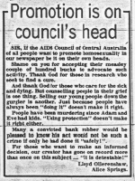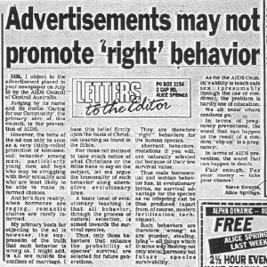 promote 'right' behavior SIR, I object to the advertisement placed in your newspaper on July 23 by the AIDS Council of Central Australia. Judging by its name and its motto 'Caring for our Community', the primary aim of this council, is the prevention of AIDS. However, the tome [sic] of the ad can only be seen as a very thinly-veiled promotion of homosexual behavior among men, particularly young men and boys who may be struggling with their sexuality and who are least likely to be able to make informed choices. And let's face reality, when hormones are raging, romantic choices are rarely informed. My primary basis for objecting to the ad is however, the suppression of the truth that such behavior is wrong as, I might add, is all sex outside the confines of marriage. I base this belief firmly upon the basis of Christian teaching as found in the Bible. |