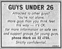 Attracted to other guys? You're not alone. More guys than you think feel this way - it's OK. For more information on safe sex and support groups for young guys, phone Mark on 52 4755. Strictly confidential. |