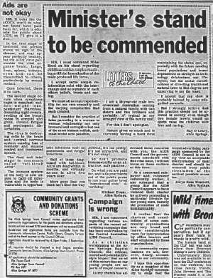 SIR, We wish to draw your attention to the advertisements which were inserted in the Centralian Advocate July 23 and 27, 1993. This advertisement and others along similar lines are proposed to run for the next five weeks. According to the AIDS Council of Central Australia (ACOCA) this is a specially funded pilot campaign which, if successful, will then be run in rural newspapers Australia-wide. In large capital cities these ads would be unnecessary as they would be inserted into gay publications, not local papers. While we understand the unfortunate need for appropriate AIDS education programs for high risk groups, we do not believe this form of advertisement is appropriate for a family orientated paper or that this ad is saying anything to convince practising or potential homosexuals to stop the dangerous sexual behavior that results in the spread of AIDS. |