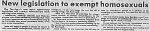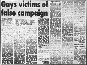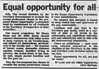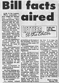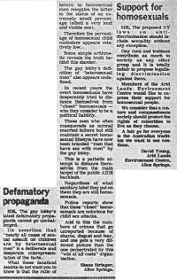As more letters to the editor began to appear in the Advocate, there was a surprisingly strong tendency for them to speak against the exemptions and in favour of equality before the law. The Christian lobby groups and letter-writing campaigns that would subsequently come to characterise queer controversies in Central Australia had yet to establish themselves. An eloquent Leigh Hillman took Shane Stringer's numeracy and understanding of child abuse to task, and offered him a spelling lesson.