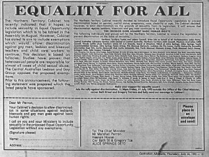 As part of the campaign we had also taken out an advertisement in the Centralian Advocate calling for support, promoting the rally, and encouraging people to write to the Chief Minister. The recent inclusion of sexuality with exemptions required some minor rewording before going to press.
