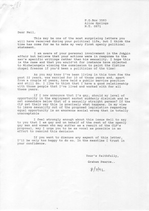 This may be one of the most surprising letters you will have received during your political life, but I think the time has come for me to make my very first openly political statement. I am aware of your personal involvement in the Joblin affair but believe that your actions were in response to the man's specific writings rather than his sexuality. I hope this is the case and that you wouldn't for instance have objected to Michelangelo winning the commission to paint the Sistine chapel frescos if you'd been a politician of the time! As you may know I've been living in this town foe the past 22 years, was married for 10 of those years and, apart from a couple of years, have held a public service position and still do. I like to think that I have a good relationship with those people that I've lived and worked with for all these years. If I now announce that I'm gay, should my level of opportunity in the employment market suddenly diminish and be set somewhere below that of a sexually straight person? If the CLP get their way this is precisely what happens. In my view to leave sexuality out of the proposed legislation regarding equal opportunity is an enormous social wrong that is totally unacceptable |