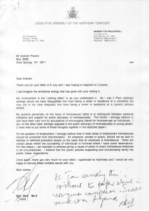 While those of us with scant regard for the conservative establishment had been publicly vocal and prepared to take direct action to confront the government, others had been working quietly behind the scenes. One of these was Graham Pearce, previously married, planning his retirement from the public service, and friend of Labor Member for MacDonnell, Neil Bell. Although Graham had only become a participant in gay society in recent years, and certainly didn't hold with street protests, he nonetheless felt strongly enough to write to the politician and out himself in the hope that it might help ensure queer Territorians were protected from discrimination.