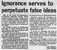 SIR, In his recent correspondence (Centralian Advocate 13-8-92) Shane Stringer purports to use "simple arithmetic" to justify a shallow and bigoted argument that sexual abuse of children is more frequently perpetrated by homosexual males than heterosexual males. Mr Stringer's effort at intellectual posturing is rather thwarted by his total failure to provide statistical data substantiating his claims. Nor does he even provide details of the "police reports" from which he has allegedly obtained the information an which he bases his opinion. It is clear that Mr Stringer lacks even a basic understanding of the issues and research related to child sexual abuse. Statistics which have been recently referred to during the Equal Opportunity Legislation debate are accepted by those professionals working with families and survivors of child sexual abuse. |