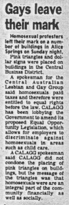 Gays leave their mark Homosexual protesters left their mark on a number of buildings in Alice Springs on Sunday night. Pink triangles and dollar signs were placed on buildings in the Central Business District. A spokesman for the Central Australian Lesbian and Gay Group said homosexuals paid taxes and therefore were entitled to equal rights before the law. CALAGG has been lobbying the Government to amend its proposed Equal Opportunity Legislation, which allows for employers to discriminate against homosexuals in areas such as child care. A CALAGG spokesman said CALAGG did not condone the placing of pink triangles on buildings, but the message of the triangles was that homosexuals were an integral part of the community financially as well as socially. |